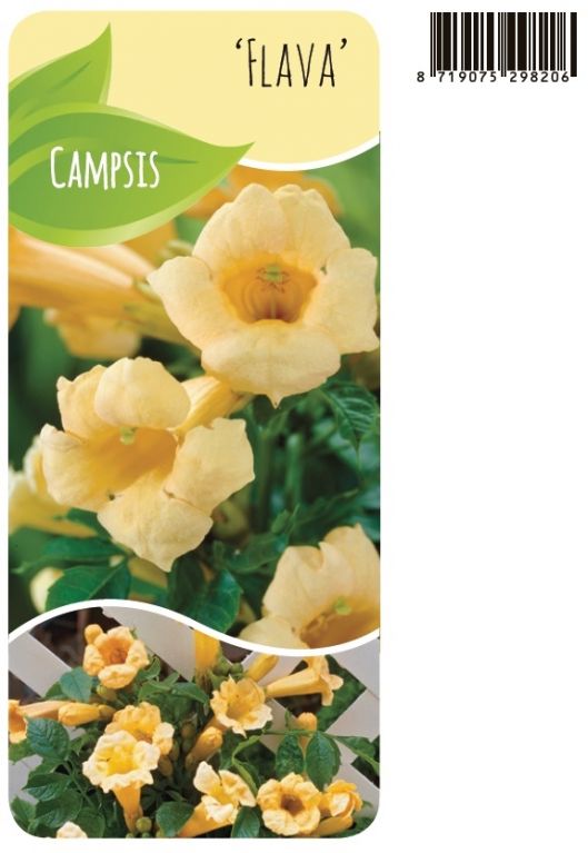 Plante de jardinCampsis Radicans 'Flava', ook bekend als de gele trompetklimmer, is een robuuste tuinplant met langwerpige, groenblijvende bladeren en opvallende, trechtervormige bloemen in helder geel. De klimplant is ideaal om de tuin verticaal interessanter te maken.